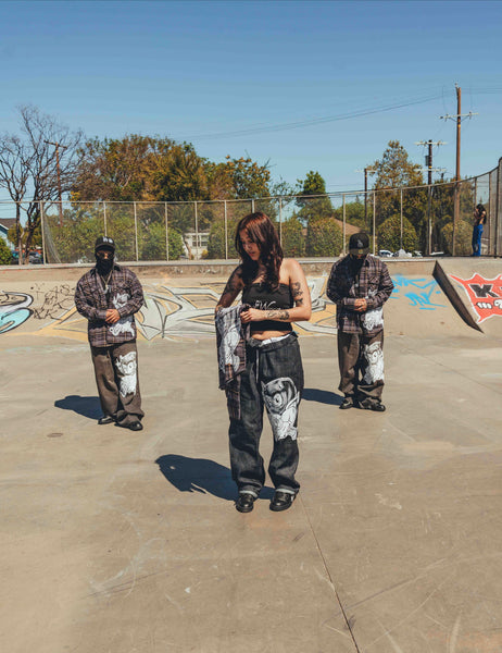 - Blk dust flannel badways Glock jeans with a white print front and back