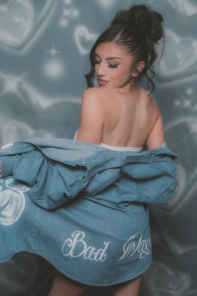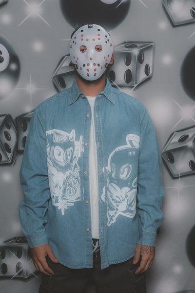 - blue denim button shirt with a white print